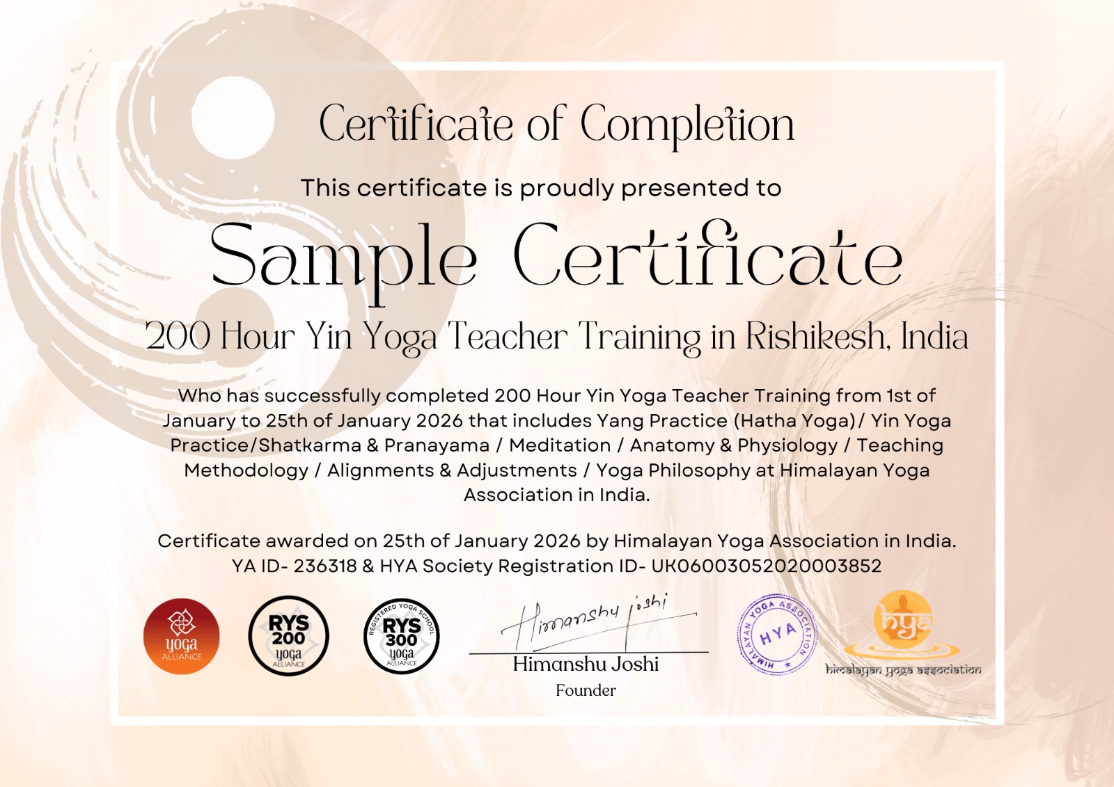 Sample Certificate for 200 Hour Yin Yoga Teacher Training in Rishikesh India