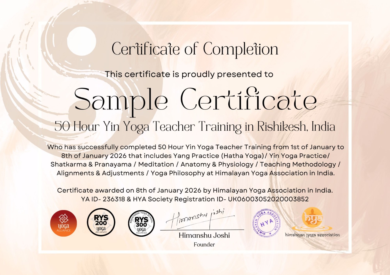 Sample Certificate for 50 Hour Yin Yoga Teacher Training in Rishikesh India